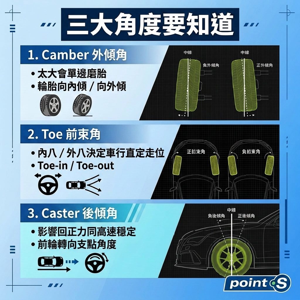 輪胎定位對於車輛保養和維護至關重要, POINT S以合理的價格為您提供優質的服務。立刻預約POINT S四輪定位服務!Point S建議一般車輛行駛每10,000公里或者1年時間需要進行一次常規輪胎定位檢查。