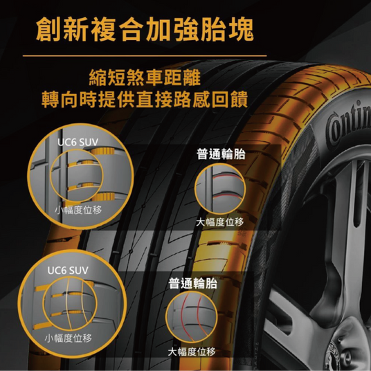 德國馬牌 (Continental) UltraContact™ UC6 SUV是一款旅行型輪胎,獨特的高速導流槽設計,利用中央胎肋獨特的管狀排水結構,利用類似屋簷排水系統的概念,讓水流快速通過排出、迅速排除水膜;而倒角花紋設計,則可將煞車力道均勻分布在胎塊之上,確保輪胎在煞車時可保最大接地面積。配搭鑽石切割花紋設計在濕滑路面下避免滑水問題出現並同時縮短煞車距離,有效提升濕滑路面安全性,為追求濕地性能,安全性,舒適性和耐磨度車主的選擇。
