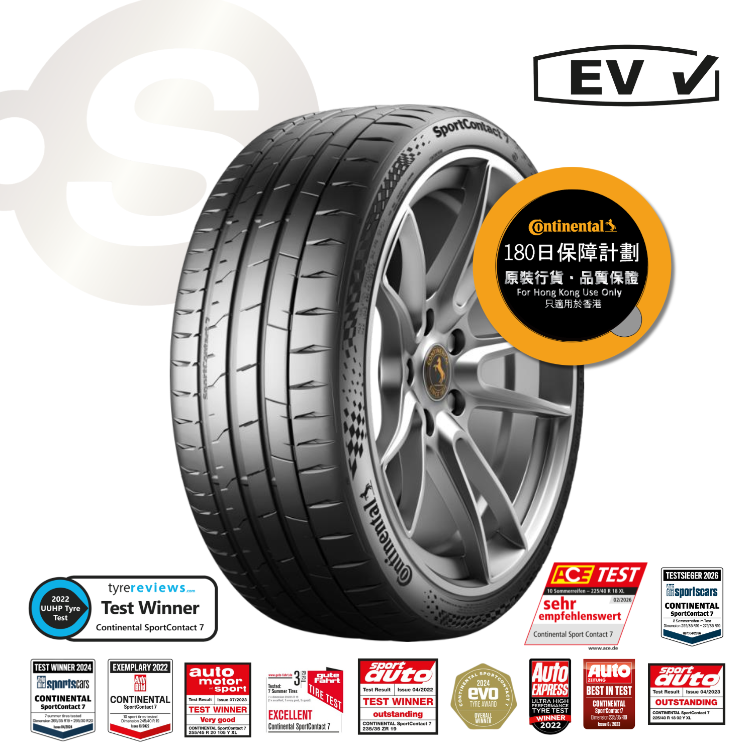 德國馬牌 (Continental) SportContact™ 7 (SC7) 為UUHP級超高性能輪胎,為駕駛者在任何乾濕路面提供連續而絕佳的操控性以及彎道極限。多個輪胎測試媒體表示 SC7 在這個級別十分全面,尤其在乾濕地操控和制動上表現一致,而且提供不俗的降噪性能和舒適性,亦使 SC7 在推出以來能夠橫掃多個獎項。在嶄新科技改良後操控和抓地力都有明顯的提升。在賽道測試上,行駛里程比上代增加 10%,濕地剎車距離減少 8%,乾地抓地性能亦提高 6%,使用壽命延長 17%。