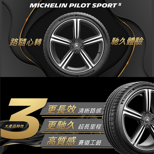 米芝連 (Michelin) Pilot Sport 5 (PS5) 是一款 UHP高性能輪胎,採用 Maxtouch Construction(最大接觸面積架構)、Dynamic Response Technology(動態響應技術)兩大技術,令輪胎的磨損更加平均,同時增加接地面積來提高抓地性能。針對性能操控、排水、耐用度等性能指標進行升級,與上一代產品 PS4 相比,PS5在抓地力表現更好,輪胎壽命亦得到提升,而且亦保證了輪胎在磨損後的性能表現維持高水平的標準。輪胎配方設計上亦兼顧了舒適性和降噪性能,提供不俗的乘車體驗。