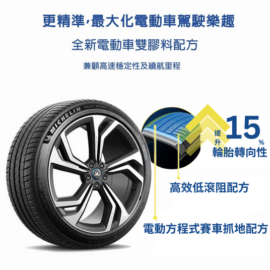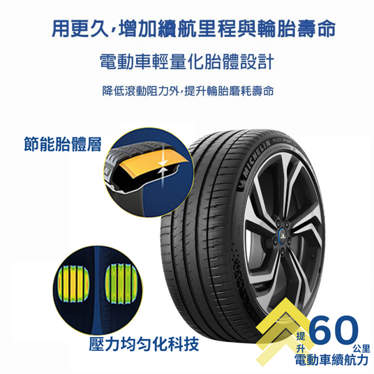 米芝連 (Michelin) Pilot Sport EV Acoustic (PSEVACC) 是一款電動車專用輪胎。輪胎採用獨家Acoustic靜音科技,以靜音海綿抑制噪音共振,有效降低約20%車廂内的噪音。該輪胎輕量化設計,降低滾動阻力,同時高剛性減低輪胎變型及減少發熱提升電動車60公里續航距離。