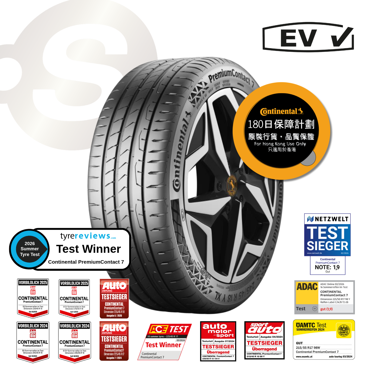 德國馬牌 (Continental) PremiumContact™ 7 (PC7) 是一款 UHP 高性能輪胎。在定位上要為乘客和駕駛者提供卓越的舒適度、可靠的安全性和獨立於車輛配置的提升里數表現。PC7 的全新的RedChili紅辣椒科技輪胎配方,可以令輪胎盡快進入工作溫度,時刻保障駕駛安全。PC7 的自適應配方就著大量車重和負載數據,確保不同尺寸規格的輪胎擁有一致的性能。而相比前代PC6,嶄新的PC7在磨耗里程、濕地操控與濕地煞停分別有著10%、5%與7%的顯著提升。